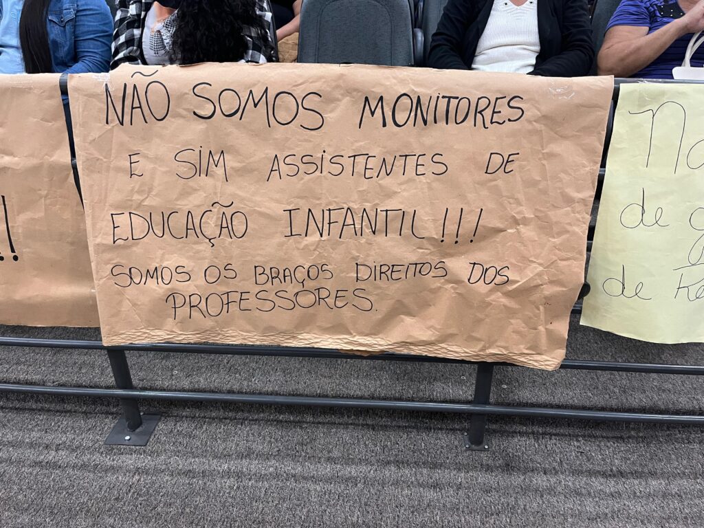 “Sem nós, a Emei não abre. O professor não pode ficar sozinho com a criança, mas a assistente pode ficar sozinha com vinte, trinta e cinco crianças. Isso prejudica a criança e prejudica o funcionário”, afirmou.