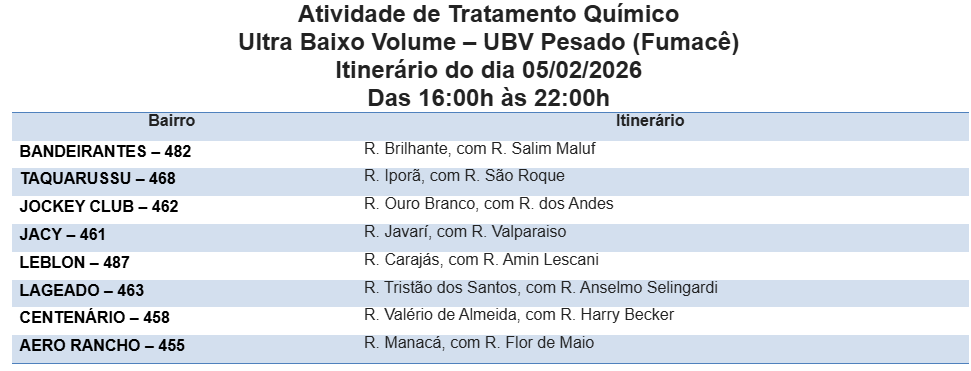 As equipes da Gerência de Controle de Endemias Vetoriais (GCEV) da Secretaria Municipal de Saúde (Sesau) circularão das 16h às 22h pelas ruas dos seguintes bairros: Bandeirantes, Taquarussu, Jockey Club, Jacy, Leblon, Lageado, Centenário e Aero Rancho.