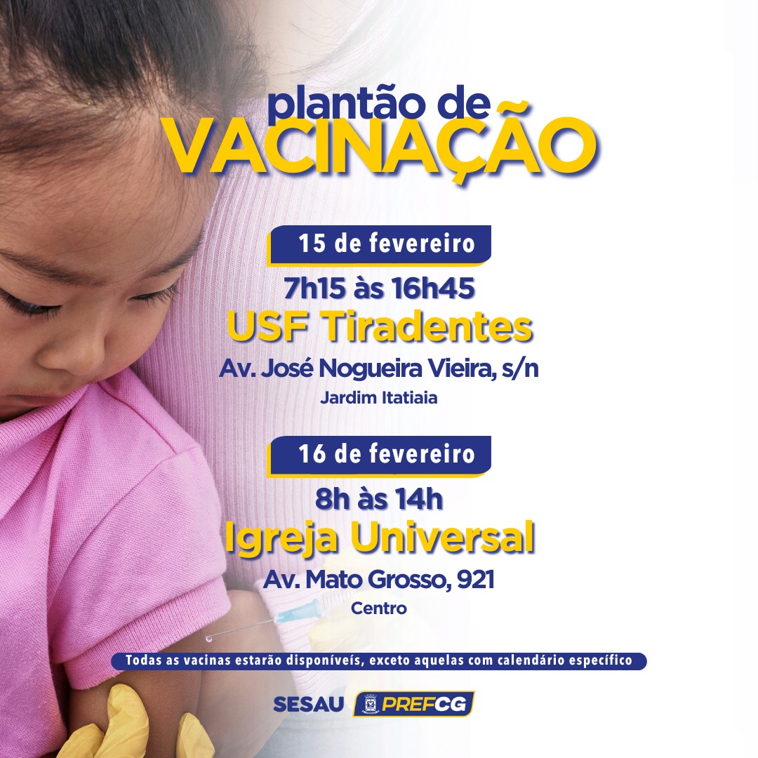 A Secretaria Municipal de Saúde de Campo Grande (Sesau) promove neste fim de semana dois plantões de vacinação para ampliar o acesso da população às doses do calendário de rotina.